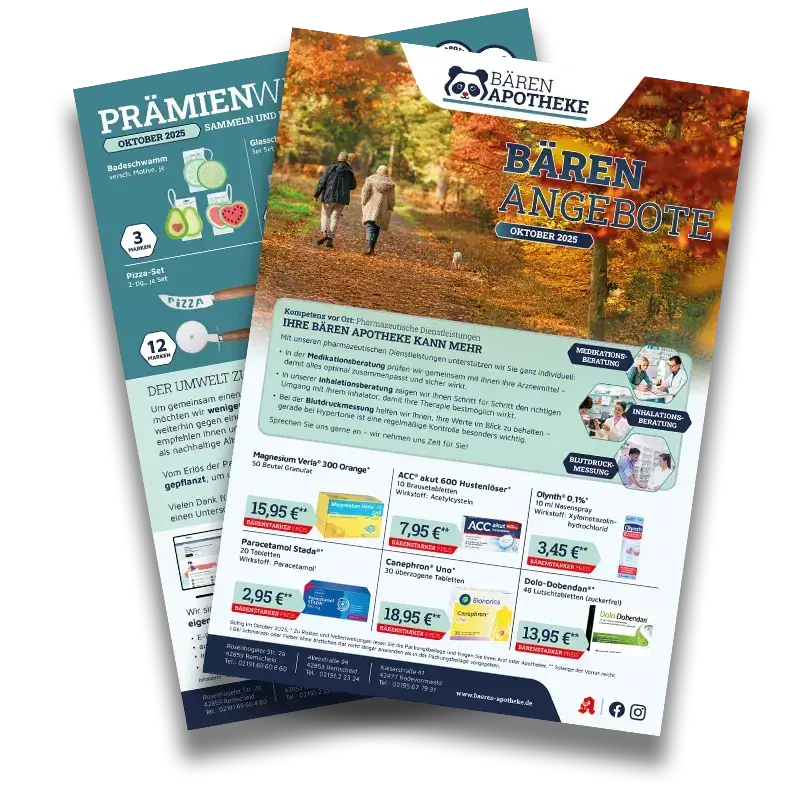 Die Bären Apotheke Prozentwoche war unsere monatliche Aktion um an festen Tagen 20 Prozent auf Ihren Einkauf zu sparen. Seit dem 01.03.2025 erhalten Sie stattdessen auf Ihrer Kundenkarte einen persönlichen 20% Gutschein, den Sie an einem beliebigen Tag einlösen können.