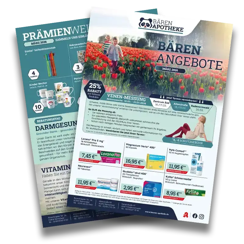 Die Bären Apotheke Prozentwoche war unsere monatliche Aktion um an festen Tagen 20 Prozent auf Ihren Einkauf zu sparen. Seit dem 01.03.2025 erhalten Sie stattdessen auf Ihrer Kundenkarte einen persönlichen 20% Gutschein, den Sie an einem beliebigen Tag einlösen können.